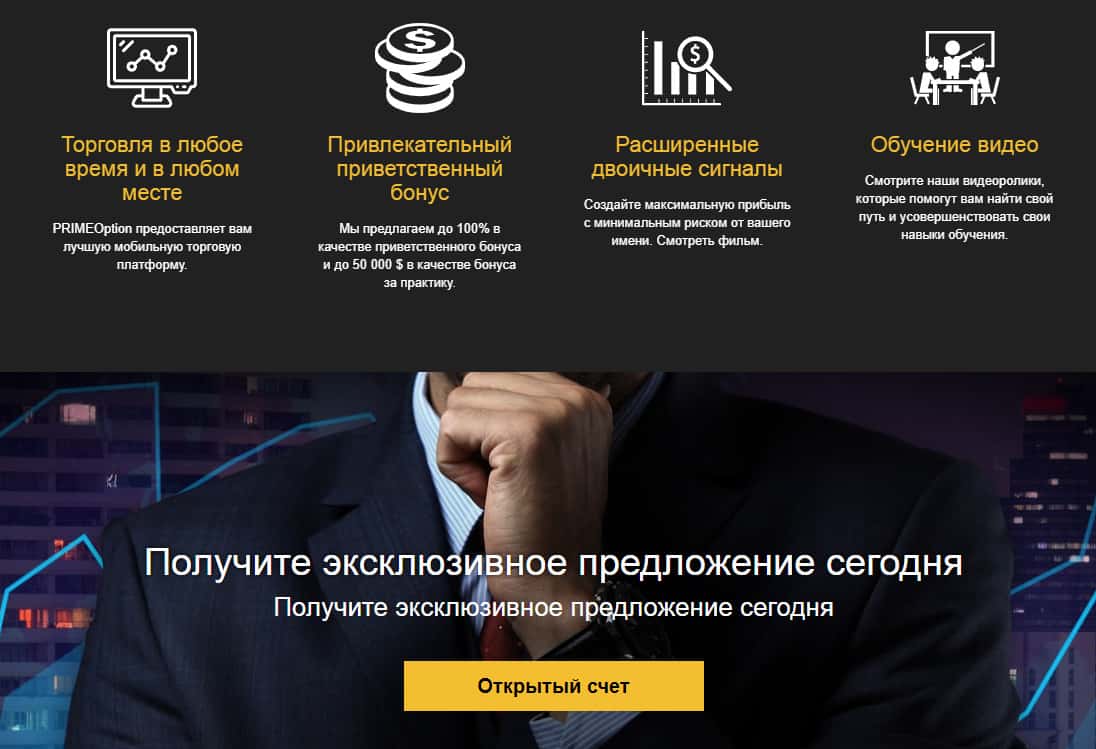 После у жулья Прайм Опцион следует довольно банальный и малоинформативный раздел, в котором у аферистов PrimeOption представлены их довольно сомнительные преимущества, на основании которых жулики Прайм Опцион будут разводить клиентуру. На изображении, расположенном ниже, вы можете наглядно увидеть очередной раздел сайт проходимцев.