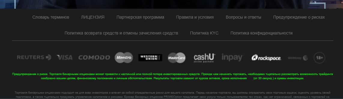 Завершается же сайт у лохотрона Прайм Опцион вполне стандартно и типично, а именно ссылками на различные разделы подвального сайта аферистов PrimeOption, а так же отказом от ответственности проходимцами Прайм Опцион за потери наивной клиентуры. На изображении, расположенном ниже, вы можете наглядно увидеть окончание сайта мошенников PrimeOption.