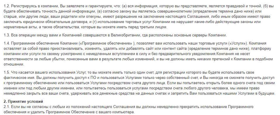 Условия сотрудничества мошенников Прайм Опцион начинаются довольно стандартно и ожидаемо, а именно информацией о том, что это за документ и зачем он нужен, в ходе чего аферисты PrimeOption говорят о том, что клиентура принимает данные условия фактом регистрации на данном подвальном сайте, что вы можете прочесть на изображении ниже.