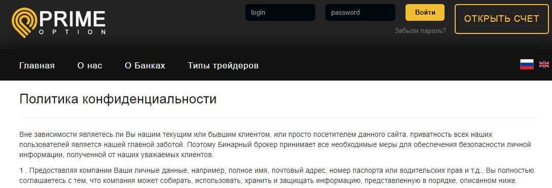 - Условия политики конфиденциальности проходимцев PrimeOption