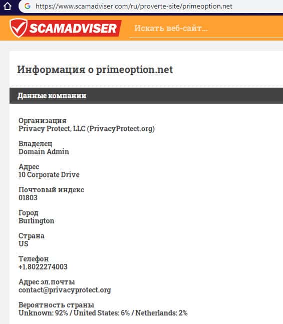 - Руководители жулья PrimeOption определенно предпочитают анонимность