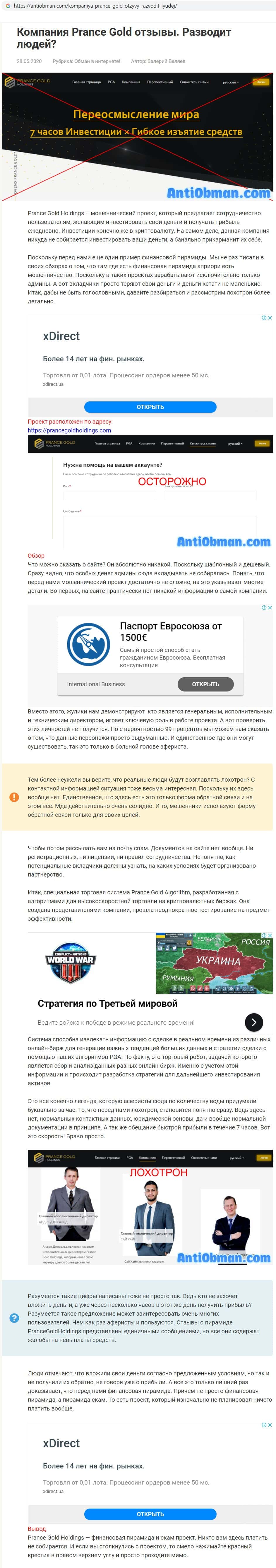 Так же интернет ресурс antiobman com опубликовал информацию о проекте PranceGoldHoldings, сайт назвал фирму финансовой пирамидой и скам проектом.