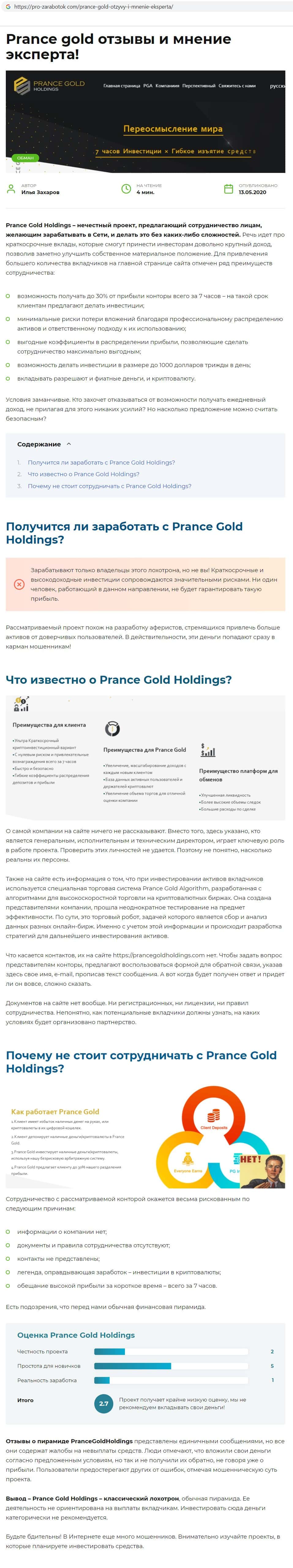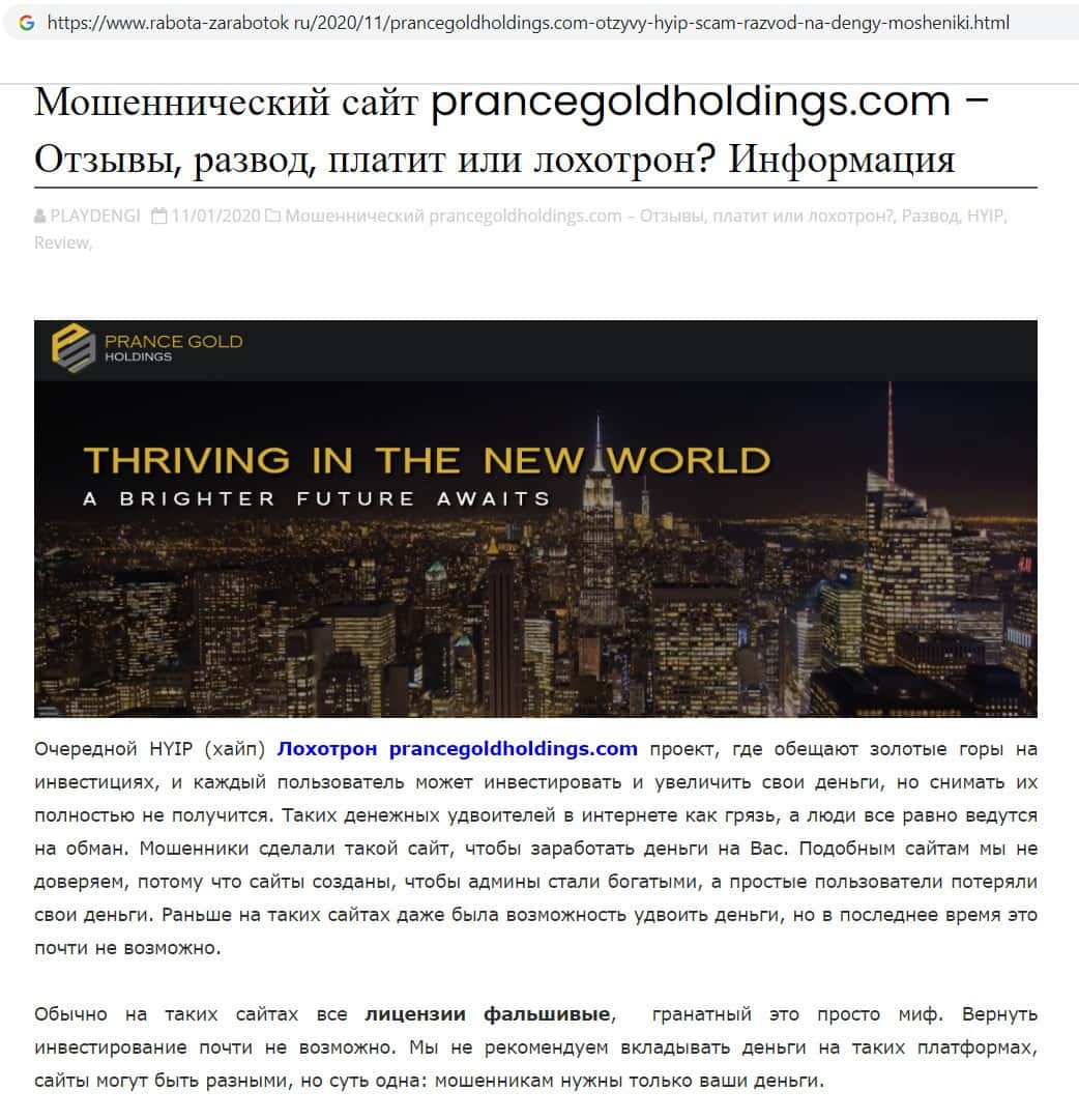 Интернет ресурс pro-zarabotok com опубликовал статью о компании кидал PranceGoldHoldings, в которой рассказал, что данная фирма является обычным лохотроном.