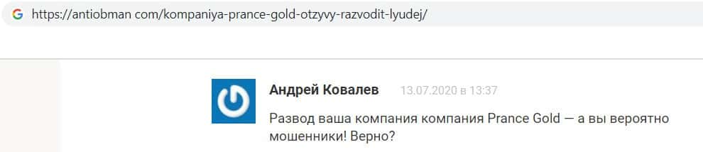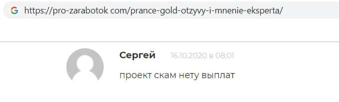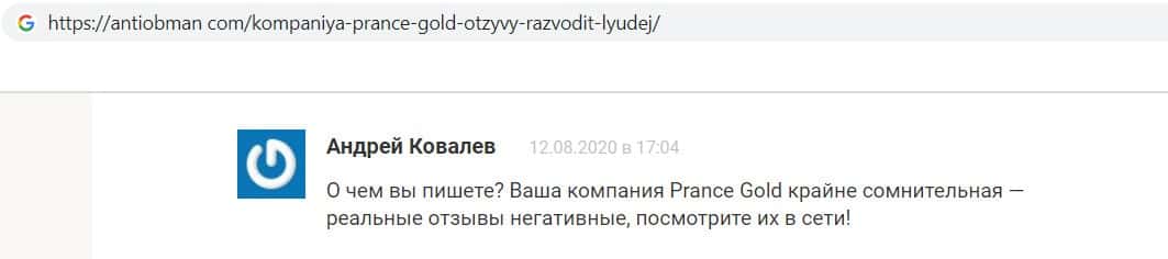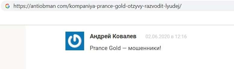 Ещё один пользователь назвал фирму PranceGoldHoldings очень сомнительной, так же он добавил, что немногочисленные отзывы о компании носят исключительно негативный характер.