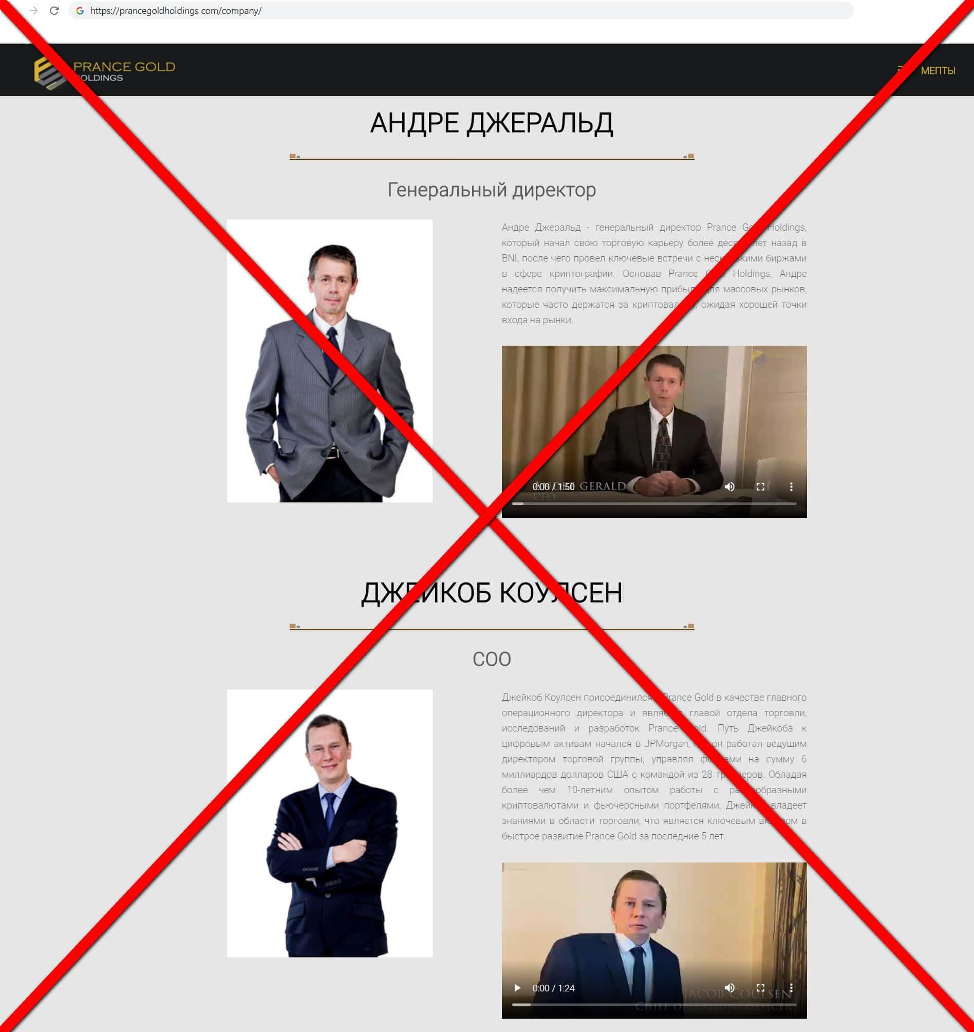 Фирма разводил PranceGoldHoldings представила клиентом своё фальшивое руководство. Компания выставила фальшивые фотографии и указала выдуманные имена сотрудников.