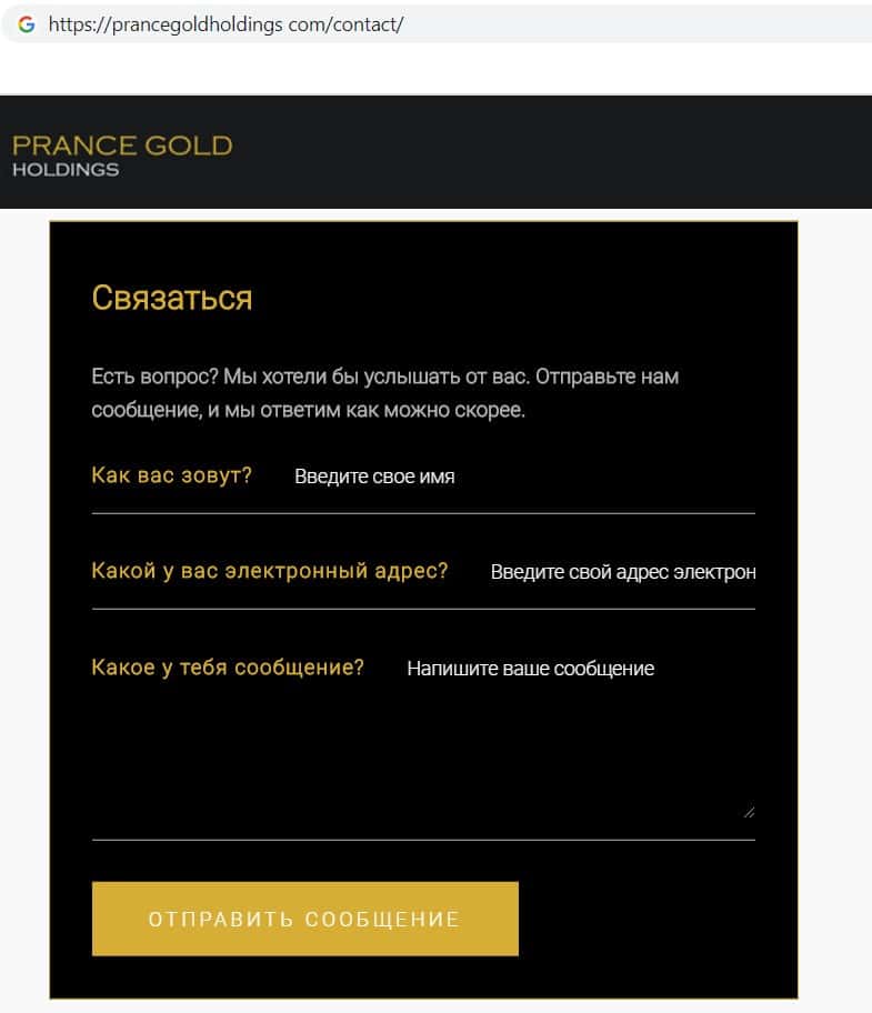 Фирма мошенников PranceGoldHoldings не предоставила никаких контактных данных, кроме формы обратной связи. Жулики просто собирают данные клиентов и сливают подельникам.