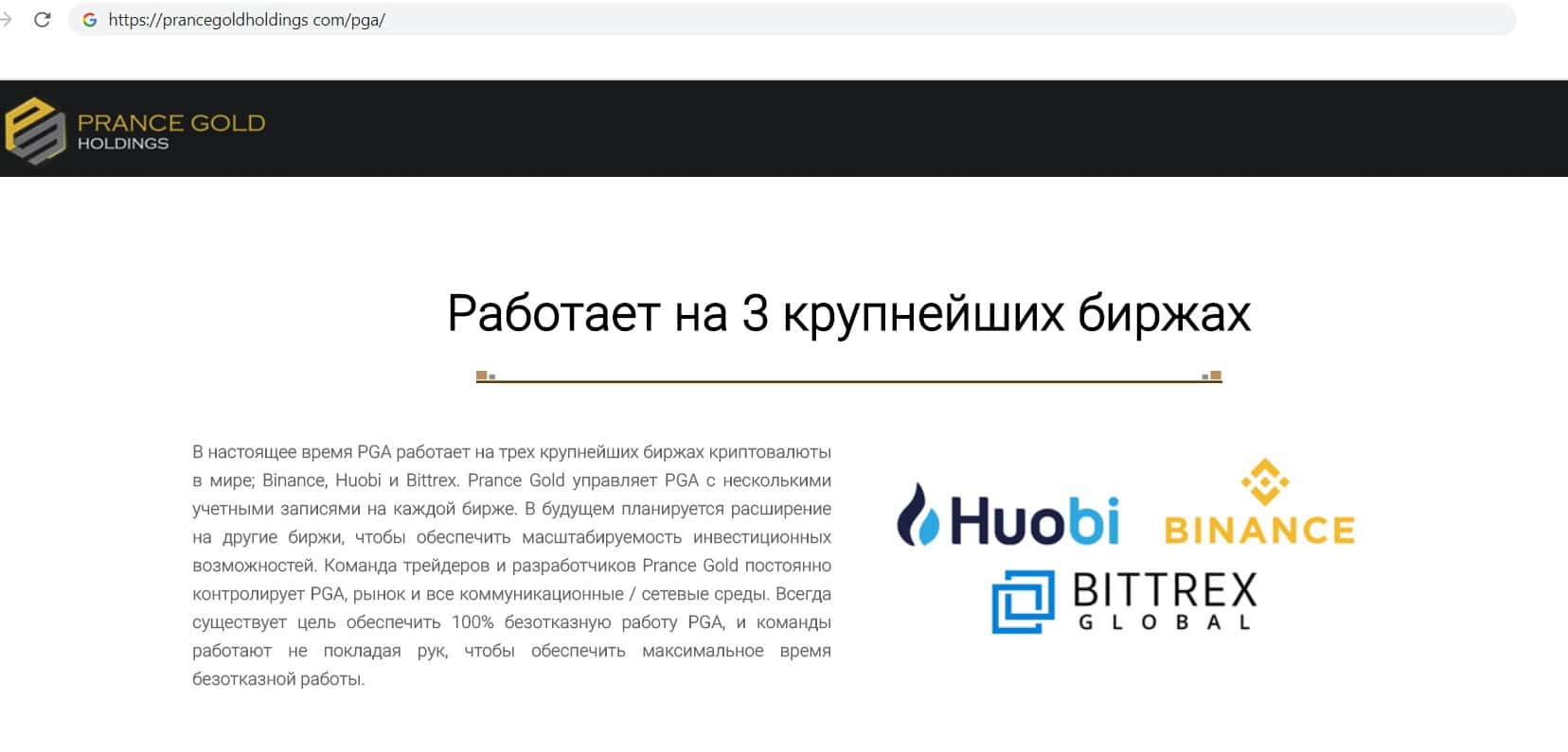 PranceGoldHoldings - очередная финансовая пирамида, которая разводит своих клиентов на денежные средства. Фирма кидал заманивает пользователей в свой лохотрон, обещая им большую прибыль в очень короткие сроки. Компания мошенников указала, что работает на трёх мошеннических биржах: Huobi, Bittrex и Binance. Фирма вместе с другими кидалами пользуется наивностью клиентов, что бы отнять их средства. Если вам дороги ваши деньги и вы не хотите их потерять, то ни в коем случае не связывайтесь с данными разводилами.