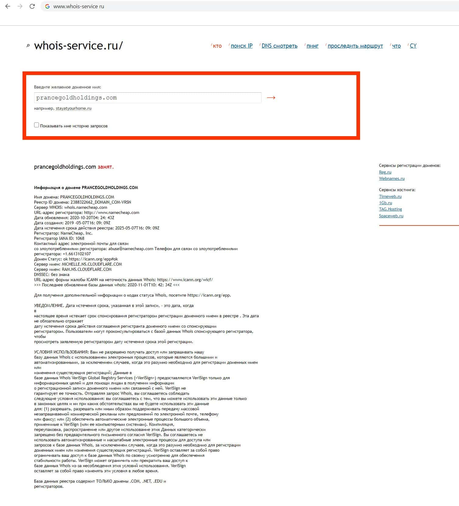 Кто является владельцем доменного адреса аферистов PranceGoldHoldings?