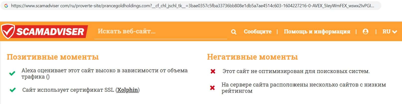 Мнение интернет ресурса scamadviser com о фирма мошенников PranceGoldHoldings