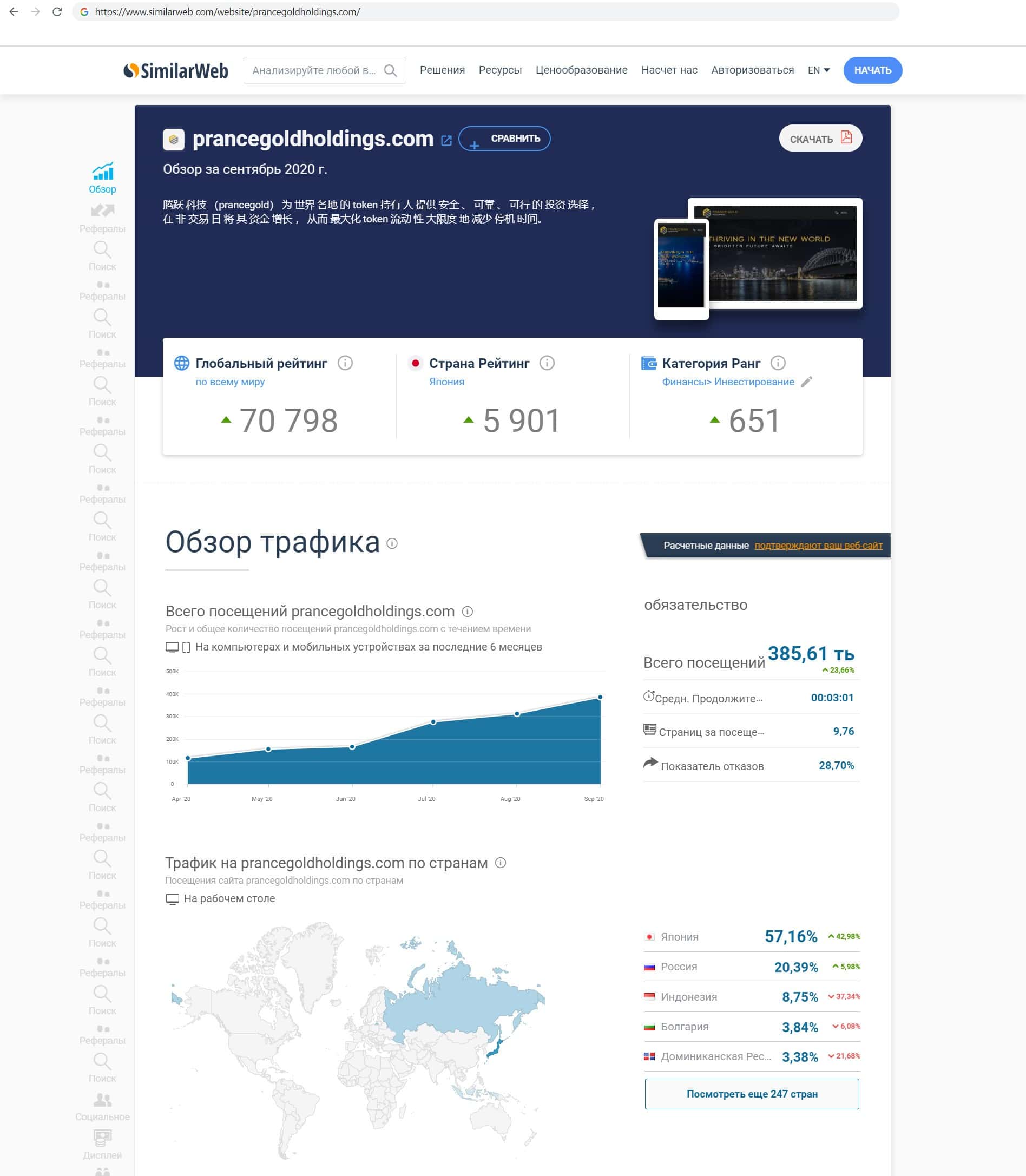 Через сайт similarweb com мы проверили трафик главного сайта кидал PranceGoldHoldings. Основная масса клиентов компании является жителями Японии и России.