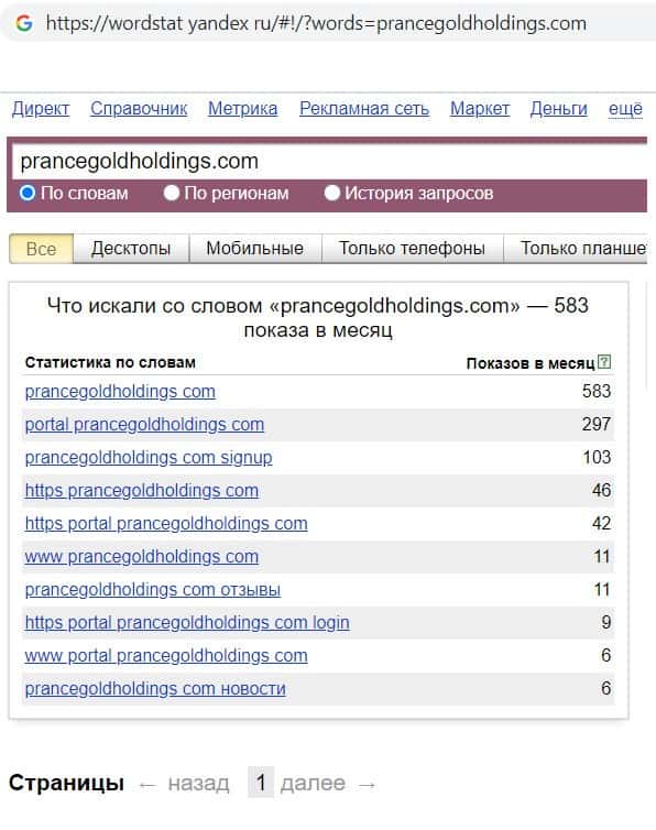 - Количество запросов компании махинаторов PranceGoldHoldings в Яндексе