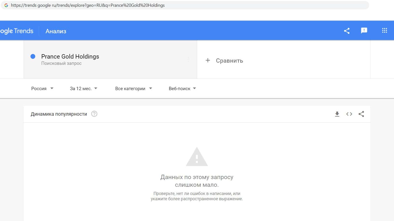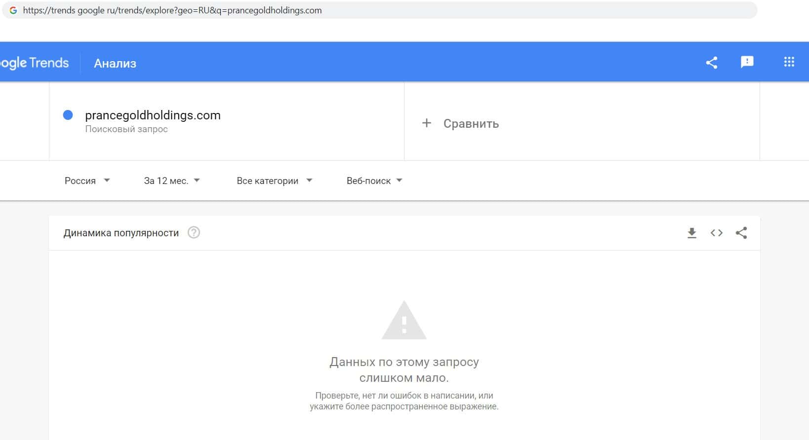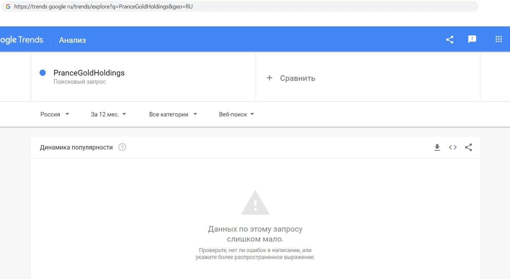 Мы решили проверить количество запросов компании жуликов PranceGoldHoldings в Google по названию фирмы, а именно "PranceGoldHoldings". Но этот запрос никто не выполнял.