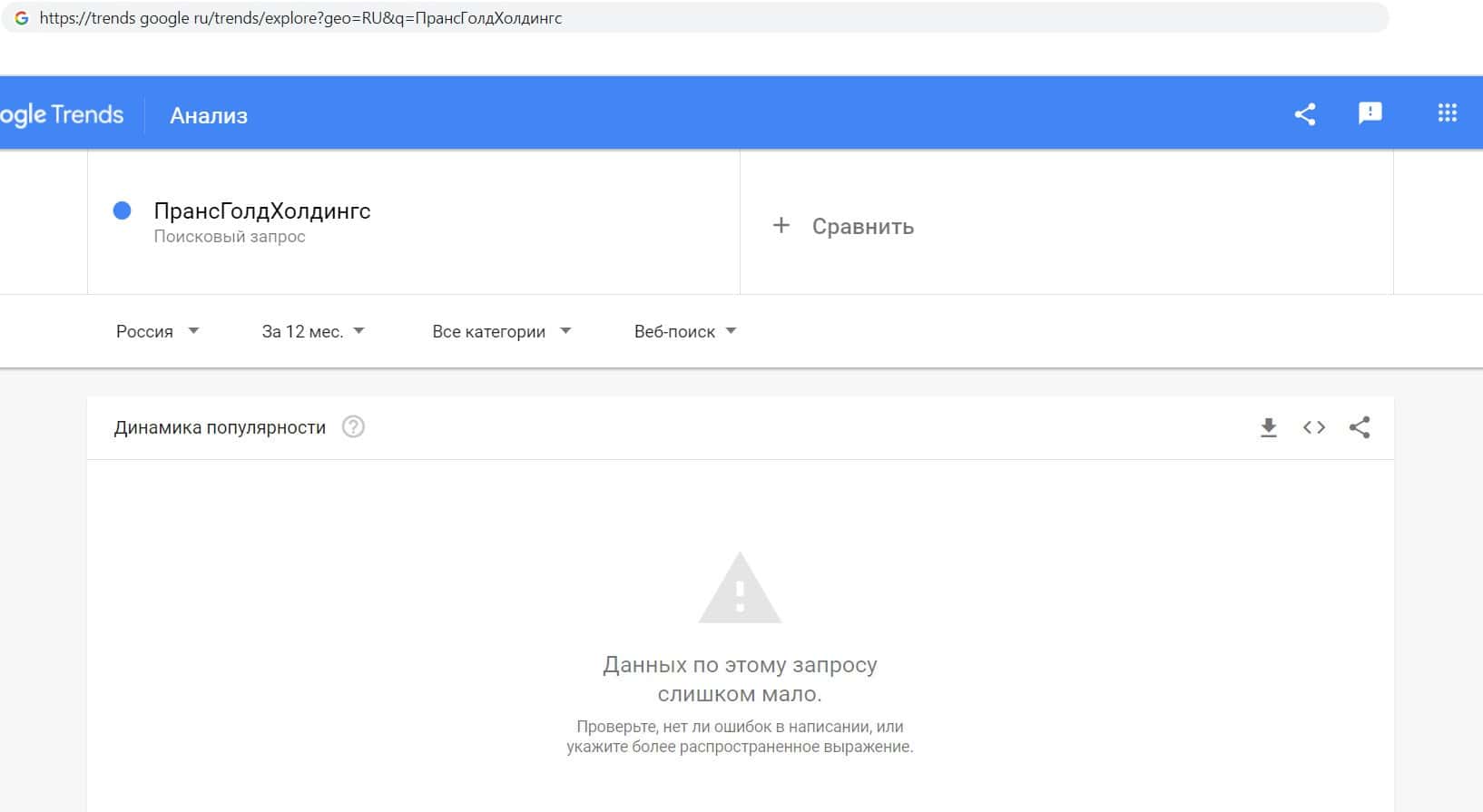Проверили мы и количество запросов компании Пранс Голд Холдингс по русскоязычному названию фирмы, но без пробелов, а именно "ПрансГолдХолдингс". Но результат - нулевой.