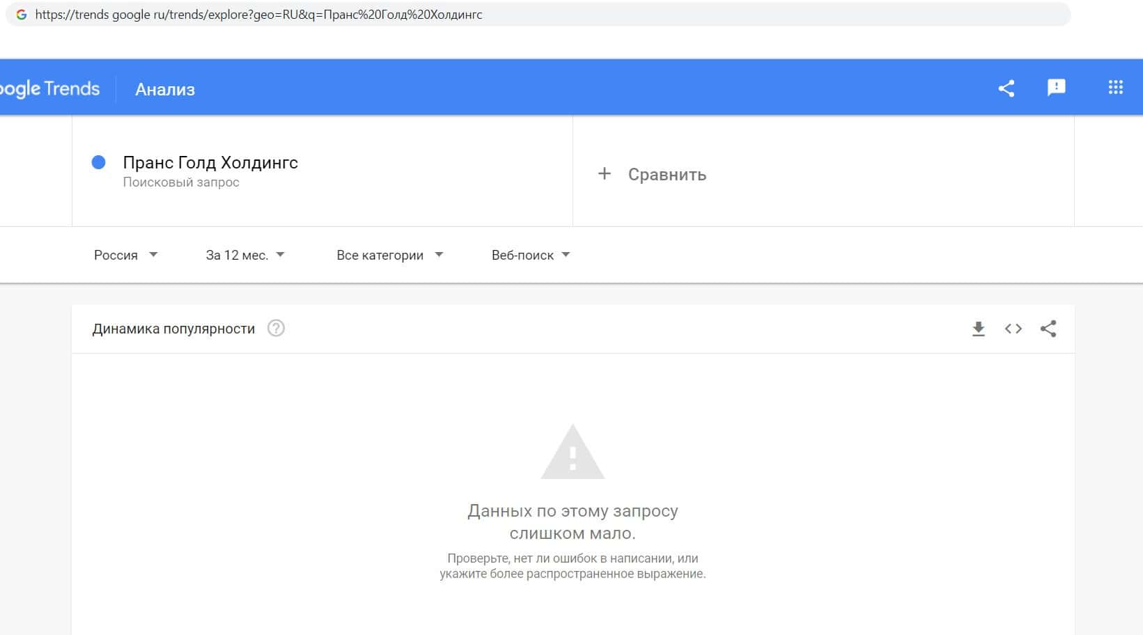 Ещё мы проверили количество запросов фирмы аферистов PranceGoldHoldings по русскоязычному названию конторы, а именно "Пранс Голд Холдингс". Но результата - нет.