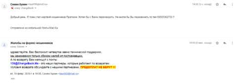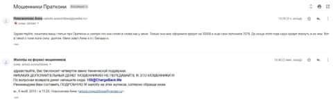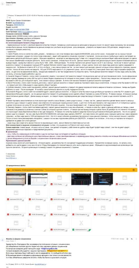 Примерно 300 000 рублей пришлось помочь человеку вернуть организации ChargeBack.Me из мошеннических кухонь ПратКони и БорманКорп. Шулера заманили его, вытянули деньги, а потом слили депозит. После того как аферисты попросили вложить повторно для восстановления баланса, то жертва повелась. В итоге счет был заблокирован, а также никто из службы поддержки форекс-лохотрона Pratconi не выходил на связь.