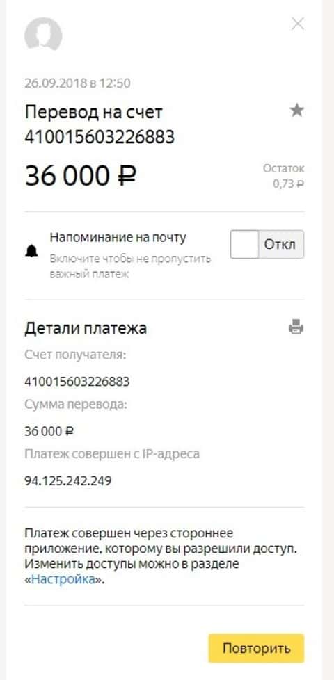 Дальше мы смотрим как таким же образом клиент перевел 36 000 рублей на счет аферистов Pratconi.