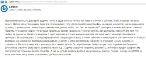 История была такая. Звонарь из кухни ПратКони наяривал на телефон в течении 3 месяцев и все же ему удалось заставить женщину открыть счет. Только не было у нее денег вообще, а нужно было положить 250 долларов. Договорились на 1000 рублей, но с условием, что жертва лохотрона передаст свои данные и согласие на оформления кредита. Она согласилась и пошла торговля, правда не с такой прибылью, которую они обещали. Тут аналитик предложил купить биткоина и удалось заработать аж 800 долларов. Но следующая сделка слила все что было. Аферисты сразу же стали просить вложить 30 000 рублей, для восстановления счета, что она и сделала. На фоне негативной ситуации, женщина поругалась с аналитиком Игорем и тот слил часть депозита и больше на звонки не отвечал. На следующий день позвонил аналитик Сергей и стал выпрашивать еще 500 долларов, но женщина смогла только 240 евро положить. Естественно, когда дело дошло до вывода, начали просить оплатить комиссию в 1000 долларов. И женщина поняла, что ее кинули.