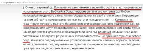 Согласно Клиентскому соглашению, которое размещено на официальном сайте, брокерская контора ПратКони не дает никаких гарантий об информации, которую она предоставляет на своем сайте. То есть можно сказать, что они пишут что попало и нести ответственность не будут, кстати договор к этому списку тоже относится.