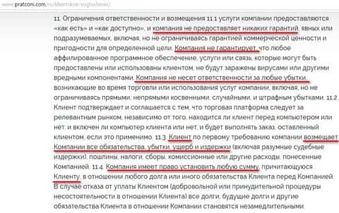 Следующий раздел об отказе от ответственности совсем жуть и не хочется в это даже верить. Компания Pratconi не несет ответственность за программное обеспечение, которое она предоставляет, не отвечает за убытки, которые она может нанести клиенту. И самое страшно, то что она имеет право потребовать от клиента деньги за то, что компания понесла убытки или потеряла прибыль. Если подпишете договор, считай что опали на деньги.