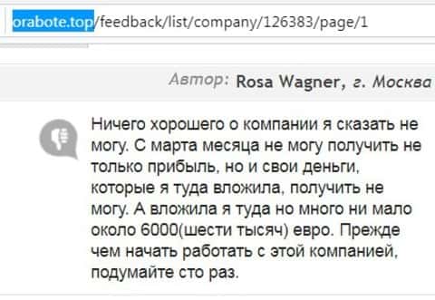 О случае кидалова в размере 6 тысяч евро можно узнать из информационного материала, который опубликован далее. Автор коммента пишет о том, что в этой кухне Форекс ей не удалось вывести ни собственных вложений, ни тех прибылей, что были получены в результате подставного трейдинга в профит, - да, именно так оно и было. Таким образом жулики создают иллюзию прибыльного дела, вытягивая из наивных интернет-пользователей немалые суммы денег.