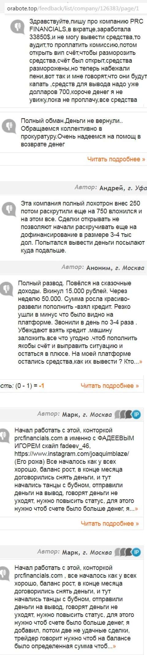 Далее рекомендую ознакомится с перечнем комментариев от пользователей всемирной паутины, которые столкнулись с аферистами Forex, работающими под видом кухонного брокера PRC Financials. Авторы публикаций пишут о принадлежности данного ДЦ к числу обычных forex-лохотронов из которых деньги клиентам не выводятся.