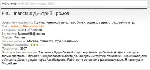 На одном из специализированных веб-ресурсов, сайте оработе топ была найдена информация о мошеннической деятельности брокерской конторы ПРЦ Файнэншилс. Далее предлагается вашему вниманию описание случая развода одного из клиентов сего лохотрона. Который лишился денежных средств на сумму в размере одной тысячи долларов. И все из-за жульнических действий со стороны кухонного ДЦ PRC Financials.