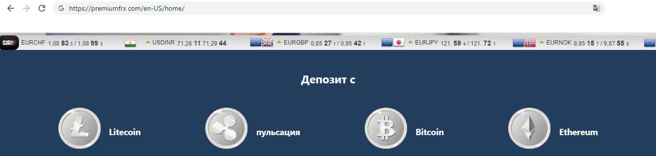 Далее следует раздел с депозитами. Мошенническая организация PremiumFRX сообщает о валюте, в которой можно вносить депозиты. Указанно, что можете инвестировать в разной криптовалюте. Жуликам без разницы в какой валюте вы будете делать депозит, для них главное что бы вы его сделали, а потом уже можно сказать, что это их деньги, а не клиентов.