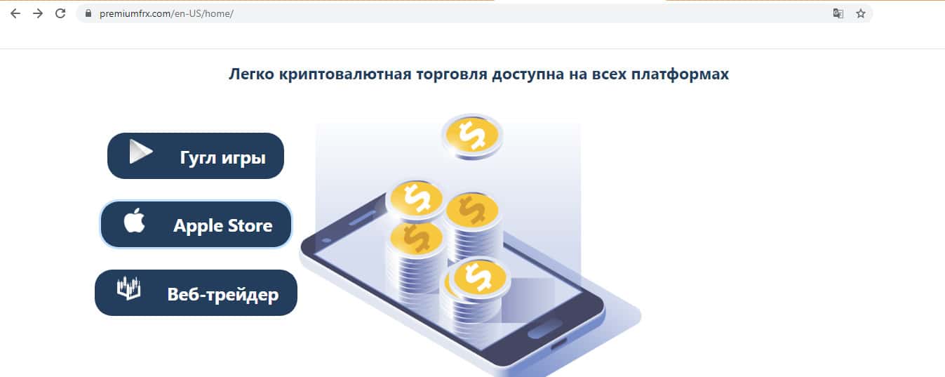 Глядя на следующий пункт главного интернет ресурса, создаётся впечатление, что это не торговая площадка, а просто большая реклама приложения. Жулики PremiumFRX снова рекламируют приложение, которое представлено на нескольких платформах, для android и ios устройств, что бы выкачивать деньги с клиентов на ходу.
