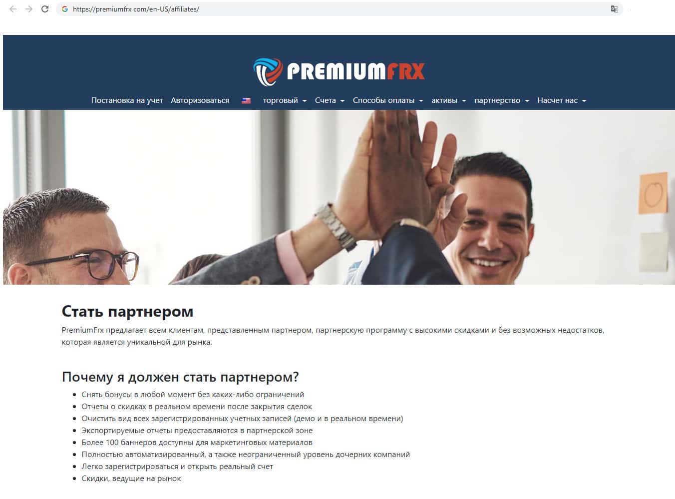 На главном интернет ресурсе мошеннической организации PremiumFRX так же присутствует некая "партнёрская программа", по которой став партнёром клиент получит кучу всяких бонусов, а помимо бонусов получит пустые карманы, посте того как аферисты обчистят их, и оставят клиента полностью без денежных средств.