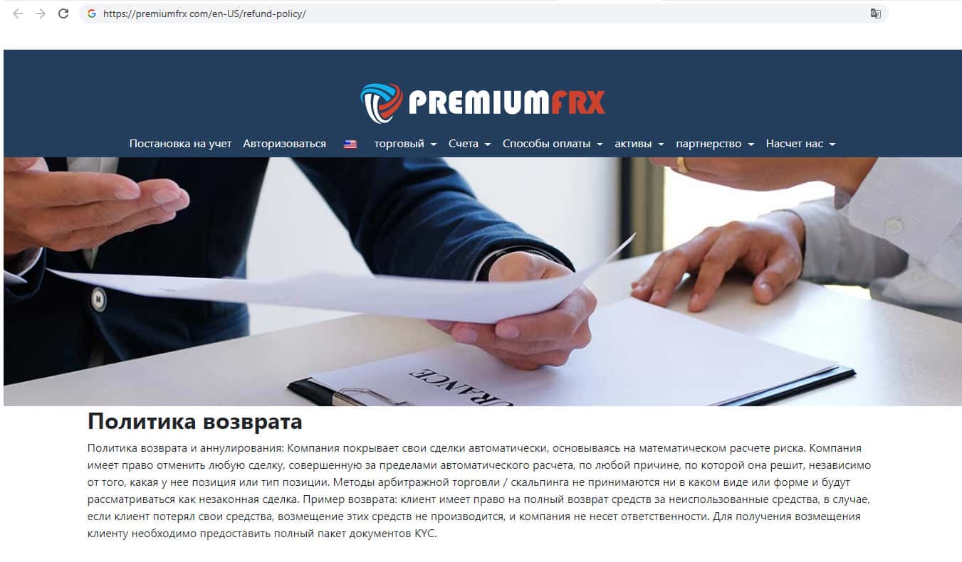 Лохотрон PremiumFRX так же предоставил политику возврата денежных средств, в которой они якобы обязуются возвращать средства, если возникли проблемы, но в политике так же указанно, что компания имеет право заблокировать любую сделку. Так, что мошенники могут просто так заблокировать сделки, если им захочется, без объяснения причины.