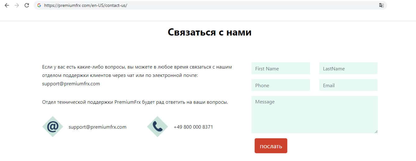 Компания разводил PremiumFRX предоставила свою контактную информация для связи с ними. Жуликам можно написать прямо из сайта компании, а можно отправить сообщение на адрес электронной почты, но ещё указан номер телефона, по которому можно связаться с мошенниками, но не ждите ответа от мошенников. Контакты аферистов: