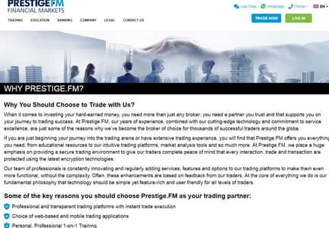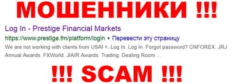 Престиж - очередные мошенники сети интернет, которые уже в течении двух полных лет занимаются наглым разводом наивных пользователей сети интернет под банальным предлогом торговли форекс, в ходе которой аферисты Prestige оперативно сливают наивной клиентуре счет. В связи с этим иметь дело и сотрудничать с лохотроном Престиж определенно не рекомендуем !!!