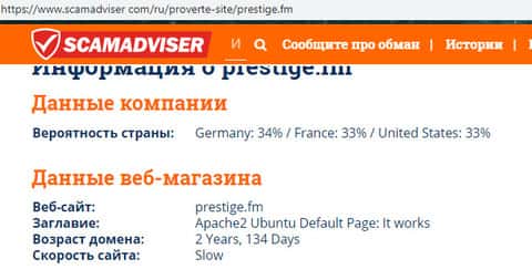 В связи с мошеннической и противозаконной деятельностью мошенников Престиж в течении четырех лет их реальные руководители предпочитают анонимность. Так же с этой целью лохотрон Prestige скрывает реальное местоположение серверов своего подвального сайта, узнать о чем можно с помощью портала scamadviser com, который вы можете увидеть ниже.