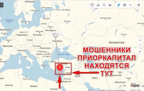 Жулики ПриорКапитал ничем не отличаются от аферистов других форекс-контор, поэтому закинули свой главный офис и регистрацию далеко в оффшорную зону на остров Кипр. Поэтому если вдруг вас кинут аферисты, то заходите на огонек к жуликам по адресу: 196 Arch. Makarios III Ave., Ariel Corner, 3030 Limassol, Cyprus.