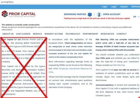 Информация, которая содержится на главной странице официального сайта конторы PriorCapital, указывает нам на то, что у них есть лицензия от Кипрского регулятора CySEC под номером 221/13. Это конечно все хорошо, но стоит все-таки указать такую вещь, как легитимация деятельности форекс-брокера. Жулики имеют право вести деятельность только на территории, где эта лицензия действует. Это далеко не все страны и в случае, если вы попадетесь в лапы мошенников, то вам нужно будет доказать полностью вину аферистов, что очень сложно, а также никто не возместит потери. Так что решать вам, связываться с лохотронщиками ПриорКапитал или нет!