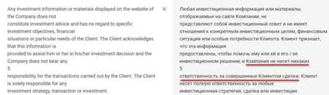 Ниже представлен перевод части договора, где контора PriorCapital отказывается от ответственности за убытки клиента, на русский язык.