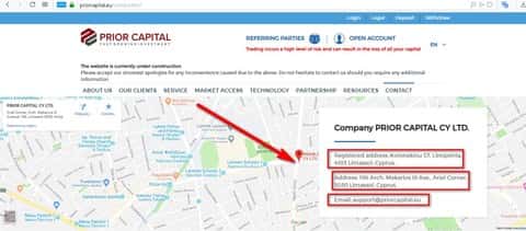 Аферисты брокерской конторы PriorCapital решили поделиться своими контактными данными, дабы втереться в доверие к своим наивным клиентам. Таким образом мы можем слетать к аферистам на остров Кипр и посетить их офис, а также написать письмо на электронную почту. А вот собственно говоря и подробная информация: