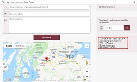 Ниже дан адрес, представленный на сайте PriveTrader, который, мало того, что к самим жуликам отношения не имеет, так еще и не совпадает с данными, приведёнными в разделе украденной документации шарашкиной конторы Прив Трейд. Вот этот адрес: Zurawia 43/207, Warsaw, 00-511, Poland.