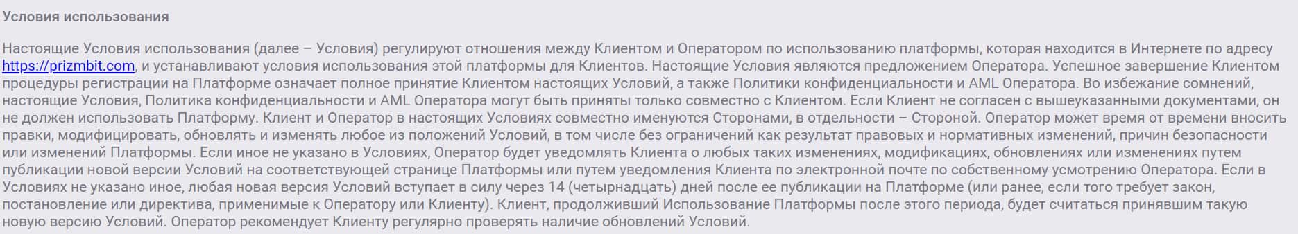 Далее представлена полная версия условий использования крипто-лохотрона Призм Бит, где можно самому удостовериться в количестве подводных камней, которые ждут клиента.