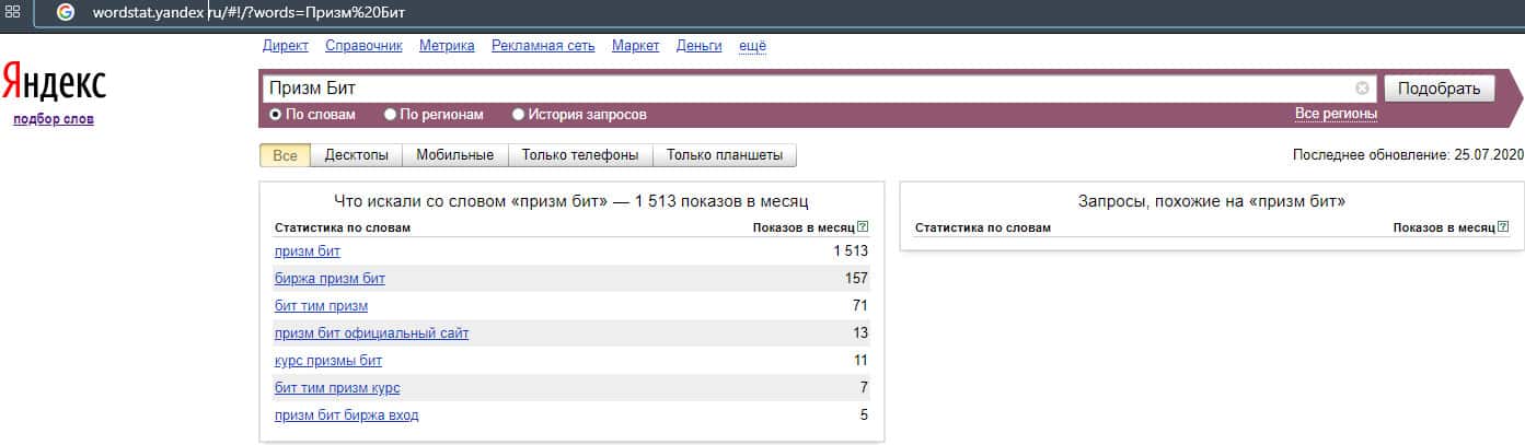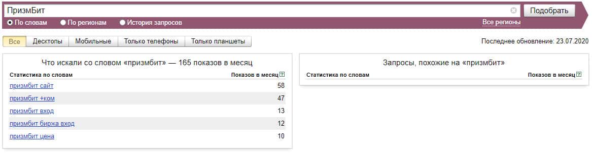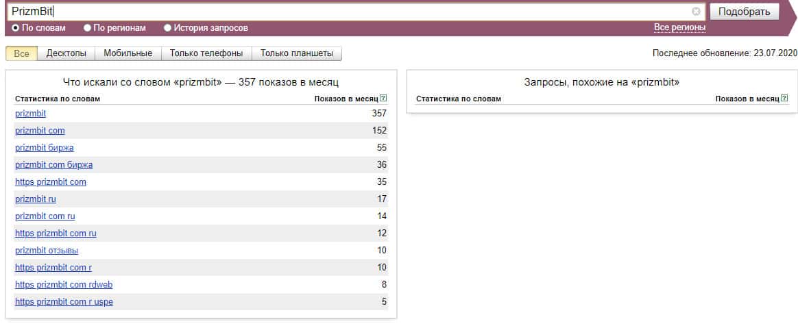 Тоже самое касается и англоязычного бренда "PrizmBit", который также, по версии ресурса Яндекс.Вордстат, который набрал 357 показов в месяц.