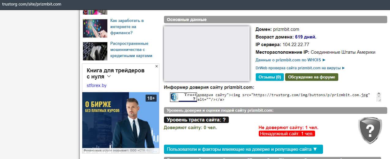 Домен крипто-конторы Призм Бит - prizmbit com имеет возраст в 619 дня на момент написания статьи, поэтому можно сразу сказать, что доверия к ним пока нет.