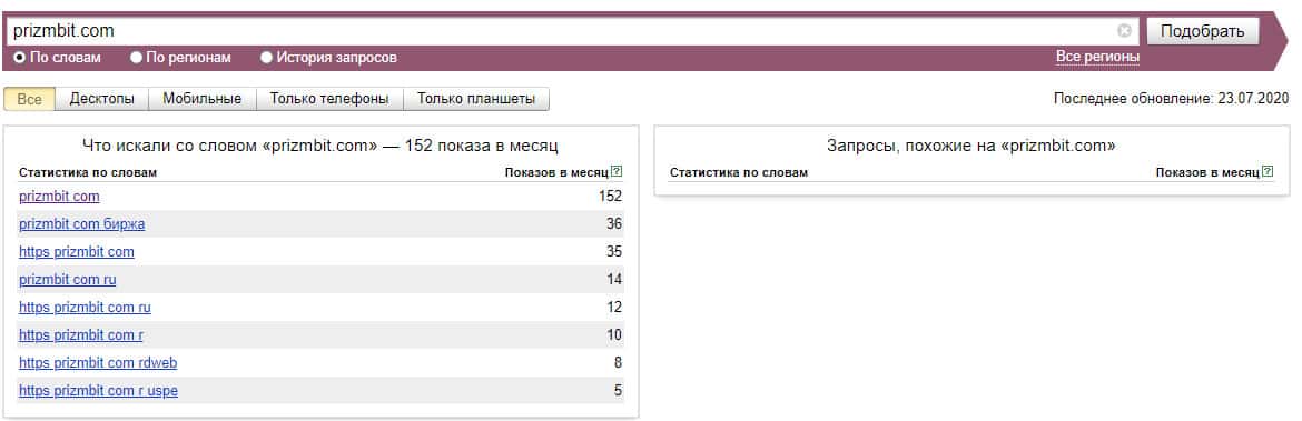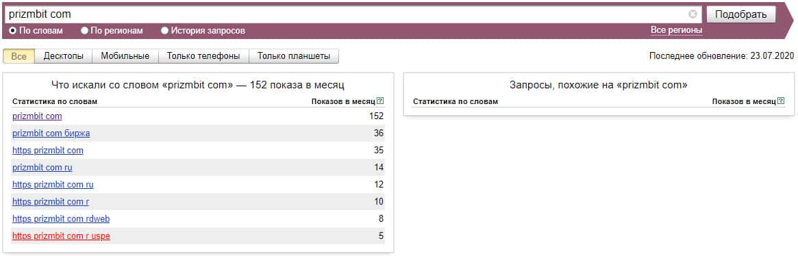 Бренд "prizmbit.com" по версии сайта Яндекс.Вордстат также отличился таким количеством запросов и этот показатель равен 152 показам за месяц.