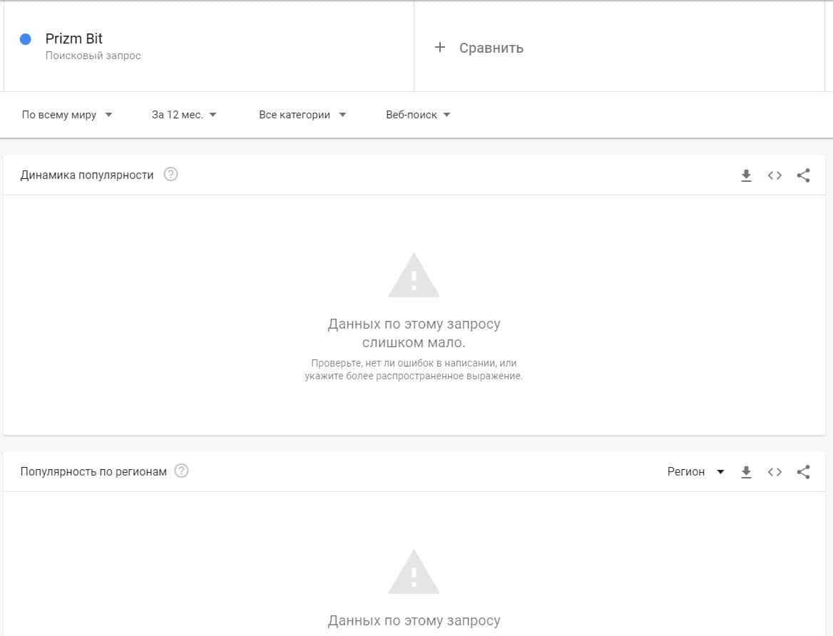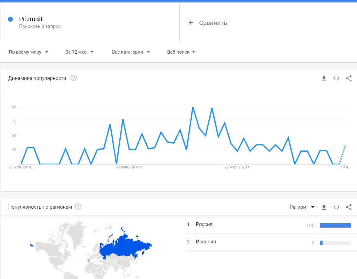 Бренд с пробелом "Prizm Bit" не имеет запросов в поисковой системе Гугл, но значит, что компания не пользуется какой-то популярностью.