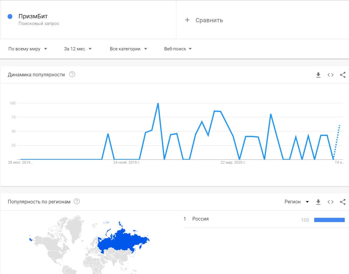 Бренд сайта "prizmbit.com" все-таки ищется в поисковой системе Гугл и не было совершено ни одного запроса по статистике системы Гугл Трендс.