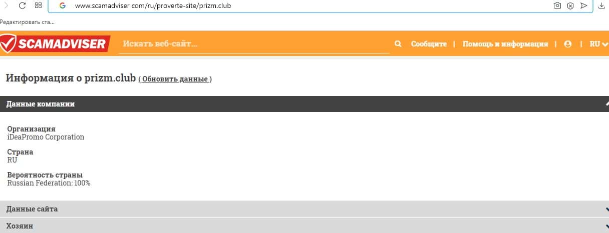 - Обзор основной страницы сайта аферистов Призм