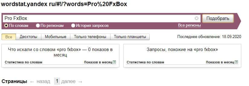 Второй запрос на английском языке с одним пробелом "Pro FxBox". Яндеск выдал результат - 0 показов за месяц.