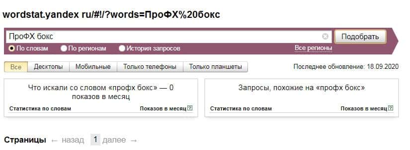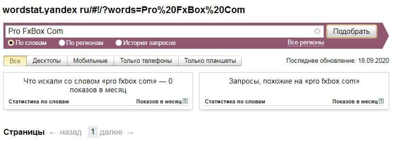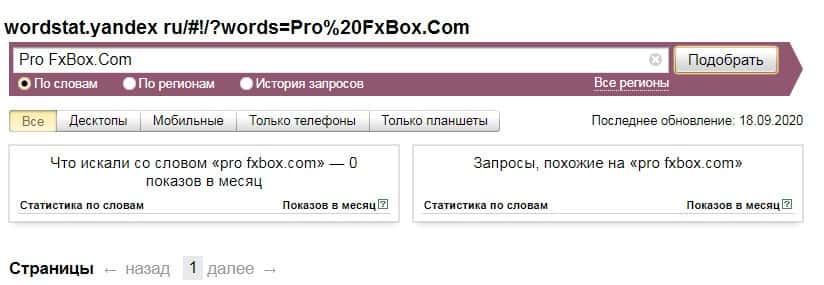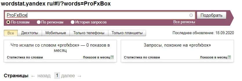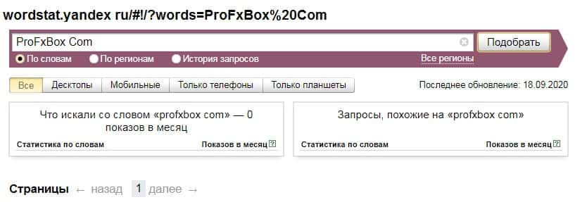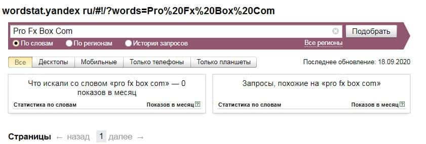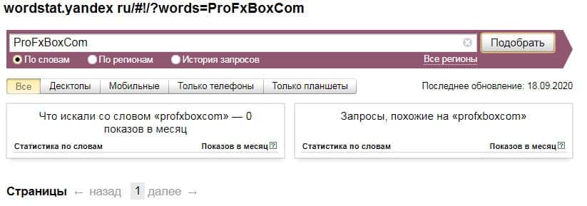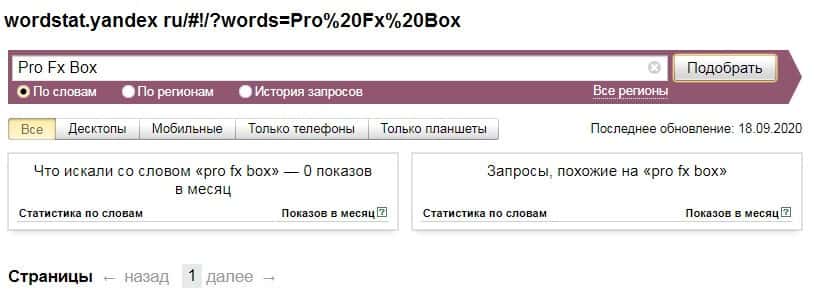 Начнем с запросов в Яндекс на английском языке. Первый запрос без пробелов "ProFxBox" выдает результат - 0 показов за месяц. Так жуликов в сети не искали.