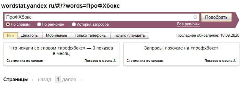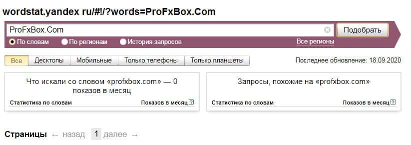 Следующий запрос на английском языке без пробелов с точкой "ProFxBox.Com". Яндеск нам выдает снова результат - 0 показов за месяц.
