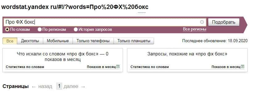 Переходим к запросам на русском языке. Первый запрос с двумя пробелами "Про ФХ бокс". Яндеск выдал результат - 0 показов за месяц. Таким образом шарагу не искали.
