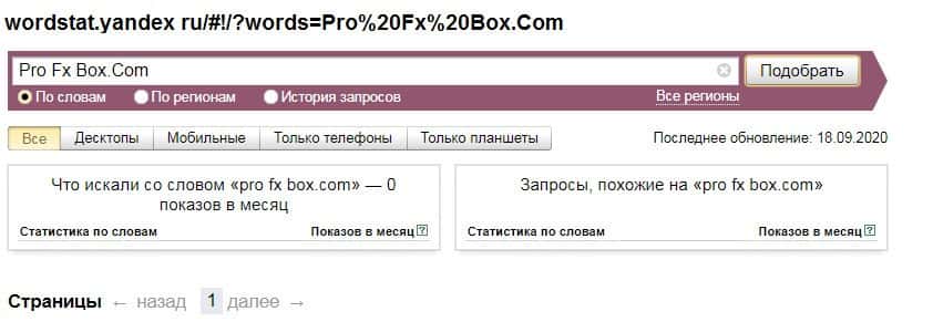Десятый запрос на английском языке с двумя пробелами и точкой "Pro Fx Box.Com". Яндеск выдал результат - 0 показов за месяц. Жулики не популярные в сети!